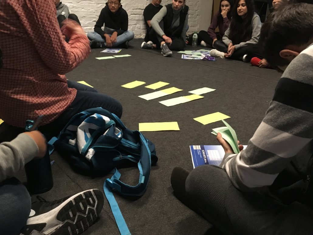 Die Schüler/innen trafen sich an der U-Siemensstadt und wanderten zu den Räumlichkeiten von Musikularium UG, wo sich alle Teilnehmer/innen in einen Begrüßungskreis setzten. Frau Küßner erläuterte daraufhin die drei Stufen von Mobbing: Exploration, Konsolidierung und Manifestation.
