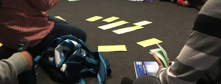 Die Schülerinnen arbeiteten daraufhin in Viererteams und schrieben auf, wer bei Mobbingvorfällen beteiligt ist. Unter Anleitung von Frau Küßner wurden die beschriebenen Karten nebeneinander gelegt, um die soziale Nähe und Distanz der einzelnen Beteiligten darzustellen.