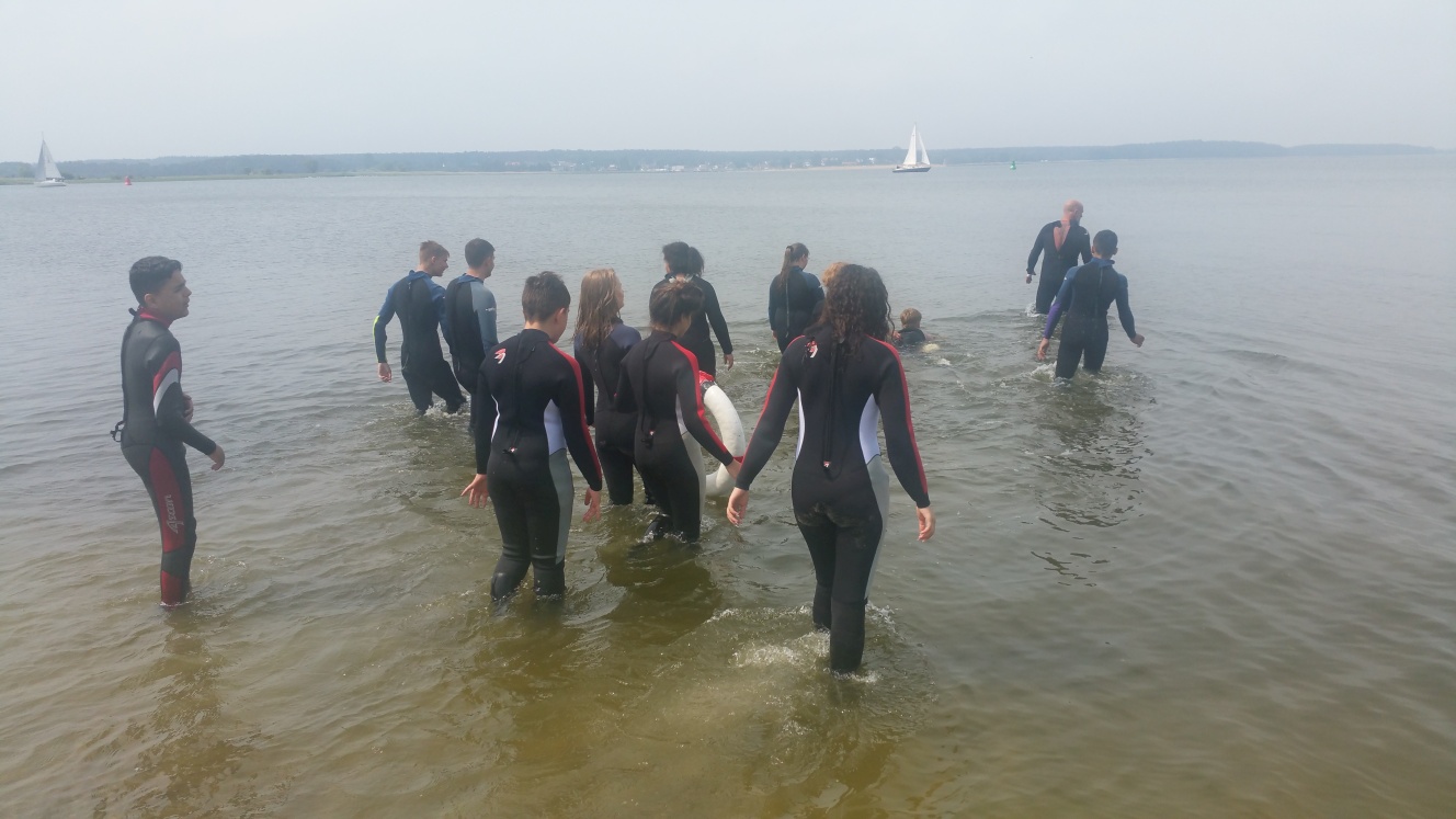 Bereits am ersten Nachmittag stand eine Wanderung in das benachbarte Karlshagen auf dem Programm. Waldwege und der Naturstrand hielten so einige Überraschungen bereit und am Strand scheuten sich einige nicht, die müden Füße in der nur 15 Grad warmen Ostsee zu erfrischen. Zum Glück legte die Sonne am Mittwoch aber zumindest vormittags eine kleine Pause ein. Ansonsten hätte so manch ein Teilnehmer der Wasserportolympiade vermutlich Probleme bekommen: Es fällt schließlich viel schwerer, den Klassenlehrer mit einem Rettungsring abzuwerfen, wenn man das gegen die Sonne tun muss… Die Teilnehmer/innen der Olympiade hatten viel Spaß auf den Surfbrettern und waren am Ende kaum noch aus den Neoprenanzügen zu bekommen. Einzelne freundeten sich mit der Idee an, künftig nur noch auf diese Art Sport zu machen.