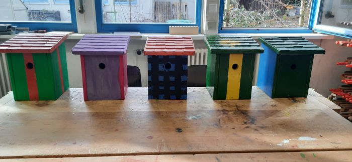 Von November bis Januar verbrachte der Schulgartenkurs der Teams Weiß und Violett eine Doppelstunde pro Woche in der Holzwerkstatt. Dort sägten, schliffen, schraubten und bemalten die Schülerinnen und Schüler eifrig das Fichtenholz und hielten sich dabei akribisch an den Bauplan und die Empfehlungen des NaBU.