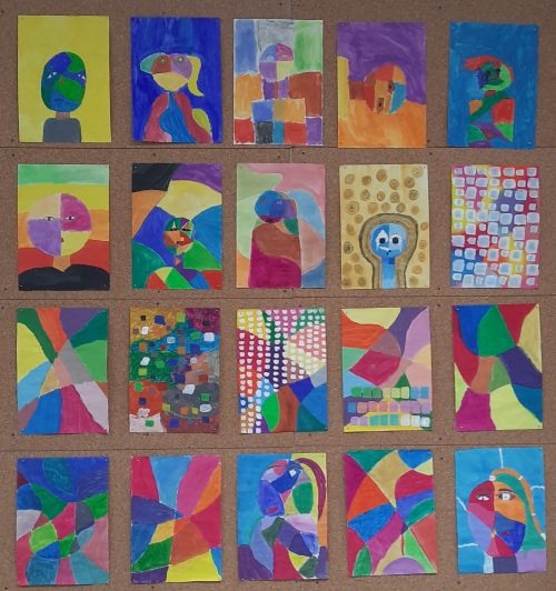 Die Klasse W4 beschäftigte sich im Projektunterricht mit dem Leben und Wirken des Künstlers Paul Klee. Für das Selbstporträt im Stil von Paul Klee fertigten die Schülerinnen und Schüler unter Anleitung von Frau Sinning zunächst Vorzeichnungen mit dem Bleistift an und legten Felder für Farbflächen fest. Mit Tusche entwickelten sie ganz individuelle Farbkompositionen.