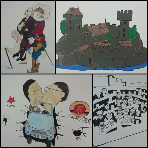 Der Klassenraum der Klasse V3 ist gleichzeitig das Geschichtslernbüro des Teams. Die Klasse hat es sich in diesem Jahr zum Ziel gesetzt, dieses in der Wandgestaltung deutlich zu betonen. Passend zu den Themeninhalten (Bausteinen) des Lernbüros entstanden im Projektunterricht Wandbilder, die jeweils von Schülergruppen der Klasse gestaltet wurden.