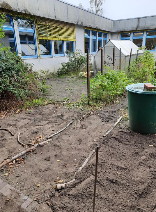 Voller Tatendrang machte sich der Schulgartenkurs in den letzten neun Wochen an die Arbeit: Wildkräuter wurden entfernt, Beete neu abgesteckt, Gründünger wurde verteilt und sogar Grünkohl und Kohlrabi hat der Kurs noch in die Erde gebracht. Vor dem Verwaltungsgebäude und im Schulgarten wurden mit Tulpenzwiebeln Muster für das nächste Frühjahr gesteckt. Das wildwuchernde Himbeerbeet hat wieder Struktur und ein Rankgitter bekommen.