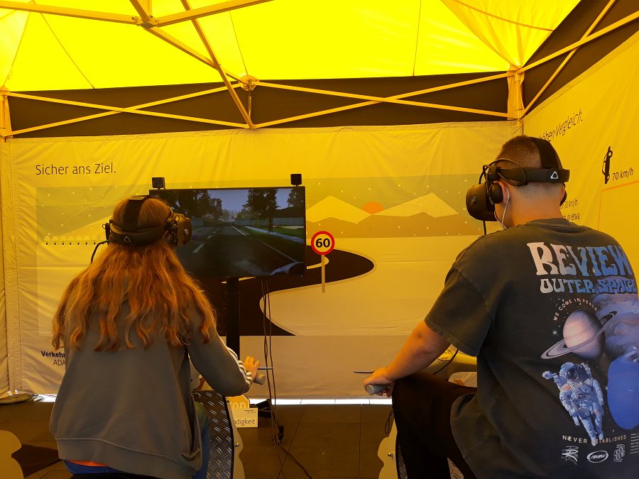 Die ersten beiden Stationen meiner Gruppe nannten sich “Geschwindigkeit”. Mit Modellen und Simulationen fuhren wir ein Auto und ein Motorrad, wobei wir auf Sperrungen, Tiere, rutschige Straßen und natürlich auf die Geschwindigkeit achten mussten. Bei den Motorrädern haben wir, um eine bessere Vorstellung von der Wirklichkeit zu bekommen, sogar eine Virtual-Reality-Brille und Kopfhörer, über die wir auch angewiesen wurden, aufsetzen dürfen.