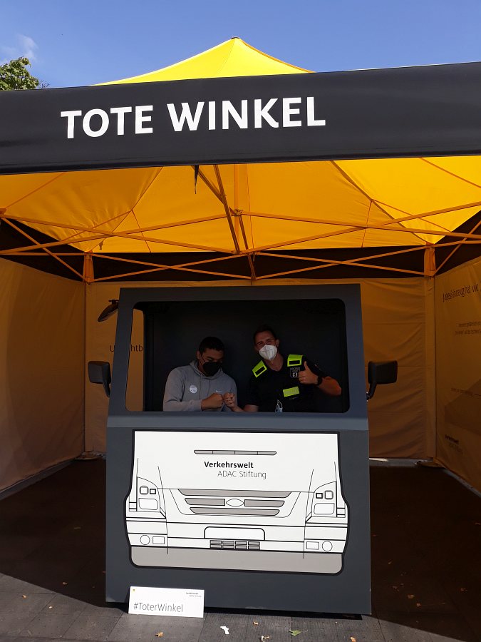 Eine weitere Station stellte die toten Winkel eines LKWs dar. Hier lernten wir die vier toten Winkel kennen, indem einer von uns sich in das LKW-Modell gesetzt hat und wir anderen uns in die toten Winkel gestellt haben. Es war ihm dann nicht mehr möglich, uns ohne Weiteres zu entdecken.