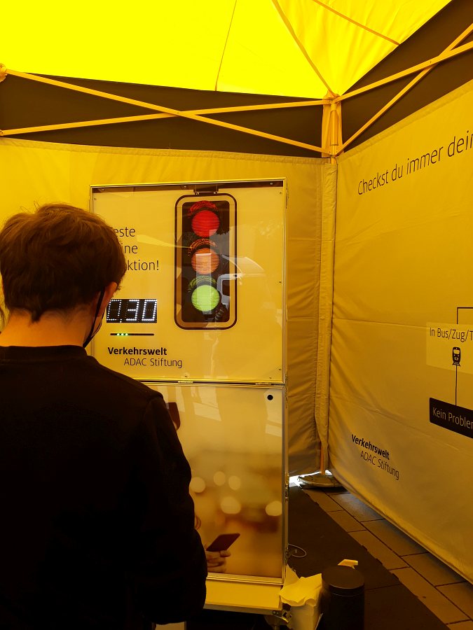 Unsere nächste Station hieß „Ablenkung”. Es gab eine Ampel, auf der Farben schnell wechselten. Immer wieder blieb sie zufällig bei einer Farbe stehen. Wir hatten einen roten, einen gelben und einen grünen Knopf auf einem Tisch. Wenn eine Ampelfarbe also stehen blieb, piepte es und wir sollten so schnell wie möglich auf den richtigen Knopf drücken. Dabei wurde unsere Reaktionszeit gemessen. Damit die Station ihren Namen aber verdient, mussten wir abgelenkt werden. Wir wurden vor die Wahl gestellt, entweder einen Chatverlauf vorzulesen oder betrunkene Freunde, die auf einer Party gewesen sind, im Auto zu haben. Die meisten von uns hat das auch erfolgreich abgelenkt und die gemessene Reaktionszeit zeigte einen deutlichen Unterschied zwischen dem Versuch mit Ablenkung und dem Versuch ohne Ablenkung.