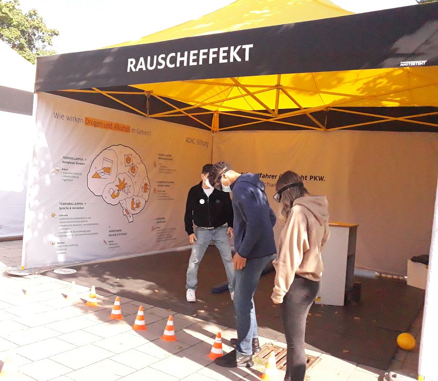 In der letzten Station setzten wir Rauschbrillen auf, um die Sicht jemandes zu simulieren, der Alkohol getrunken hat. Damit sind wir im Slalom um Hütchen gelaufen und haben uns Bälle zugeworfen. Das hat uns deutlich gemacht, dass man vor der Autofahrt zwar 0,5 Promille im Blut haben darf, es aber mit dem Alkohol lieber ganz bleiben lassen sollte.