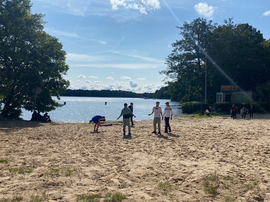 Wir sind mit der Klasse Blau 3 von der Schule durch den Spandauer Forst bis zur Bürgerablage gewandert. Wir kamen an einem Moorgebiet vorbei, das sehr malerisch war und liefen an den Bohlen der alten Gleise des stillgelegten Teilstücks der havelländischen Bahn entlang. An dem Sandstrand bei der Bürgerablage konnten wir dann picknicken, verschiedene Ballspiele spielen und Seilspringen. Bei sonnigem Wetter hatte die Klasse viel Spaß.