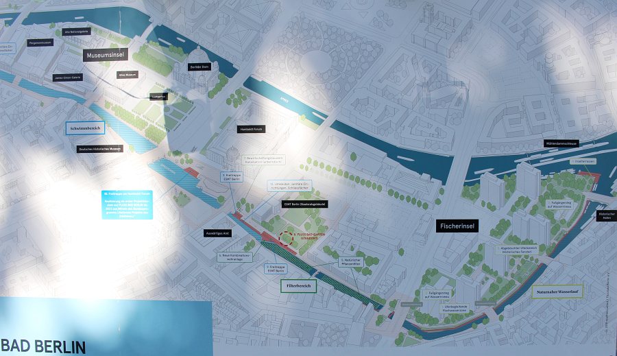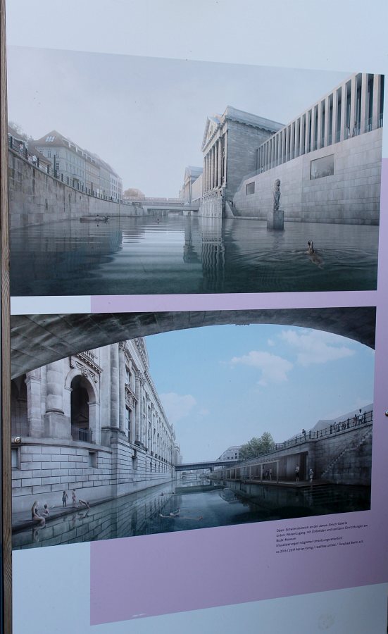 Sehr spannend zu sehen war auch das Stadtentwicklungsprojekt „Flussbad an der Spree“! Die Idee: Zwischen Fischerinsel und Bode-Museum wird man hier – wenn alles nach Plan läuft –im zuvor gründlich gereinigten Wasser des Spreekanals baden können. Noch ist das Projekt aufgrund der unmittelbaren Nähe zur Museumsinsel als Teil des UNESCO Kulturerbes heiß umstritten: Zu unterschiedlich sind die Interessen der Erholungssuchenden, die in dem Flussbad eine Aufwertung des Stadtraums sehen, und die Interessen der Verfechter*innen des preußischen Kulturerbes, die sich Badende in musealer Kulisse nur ungern vorstellen wollen.