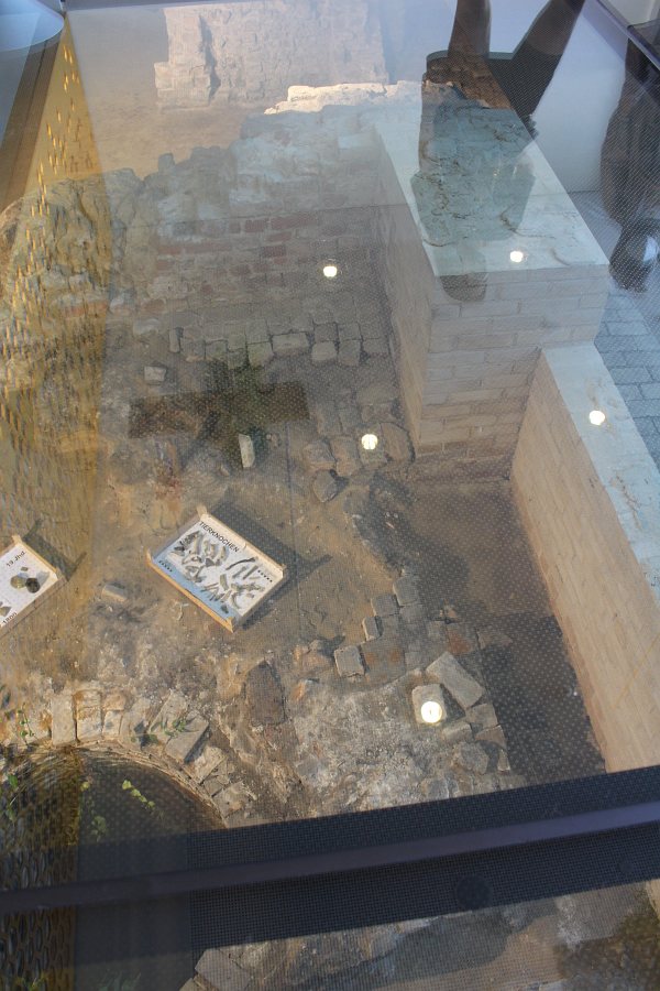 Einblicke und Durchblicke in die Berliner Baugeschichte direkt unter unseren Füßen ergaben sich im Eingangsfoyer des schicken Hotels Capri, in dem man als Besucher*in direkt durch den gläsernen Boden hinunter auf die bei Ausgrabungen freigelegten Fundamente der Stadt im Mittelalter schaut.