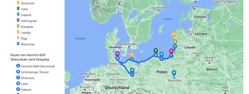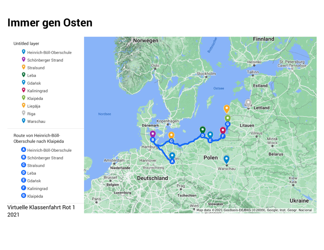 Und so trennten sich unsere Wege zum Ende des Schuljahres und Start der Sommerferien nach beinahe vier Monaten des virtuellen Reisens: Ein Teil folgte dem ursprünglichen Plan ‚immer gen Osten‘ und steuerte erst Riga, dann Tallinn und schließlich St. Petersburg an – der andere Teil brach auf in Richtung Warschau, wo alt-aussehende Gebäude, Theater, Jazz-Konzerte und Straßenkunst auch die Lehrerin anlocken sollten. Die vielen Schritte, die Rot 1 Schüler*innen von Mitte Mai bis Anfang Juni liefen, bringen die beiden Gruppen hoffentlich ohne größere Anstrengung sicher an ihre unterschiedlichen Ziele: Sei es einmal quer durch Europa über die Alpen zum Mittelmeer, oder weiter entlang der Ostsee durch Städte, Dünen, unentdeckte Buchten und über viele Grenzen.