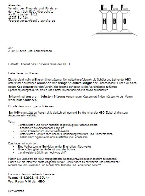 Der Förderverein der HBO bittet Eltern, Ehemalige und Interessierte um Unterstützung. Der Fortbestand und damit auch die künftige (finanzielle) Förderung von Projekten für Unterricht und Schulgemeinschaft ist aktuell massiv gefährdet. Wir freuen uns über tatkräftige Unterstützung. Alle wichtigen Informationen können Sie dem Schreiben des Vorstandes entnehmen.