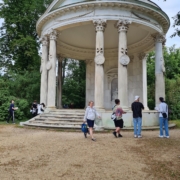 Die zweite Station war der sogenannte Freundschaftstempel. Dieser war nach antikem Vorbild erbaut worden und zeichnet sich durch vier Bilder von Freundschaftspaaren der griechischen Mythologie aus. Die Schülerinnen und Schüler haben die Namen entziffert und die Freundschaftspaare mithilfe von Infomaterial richtig zugeordnet.