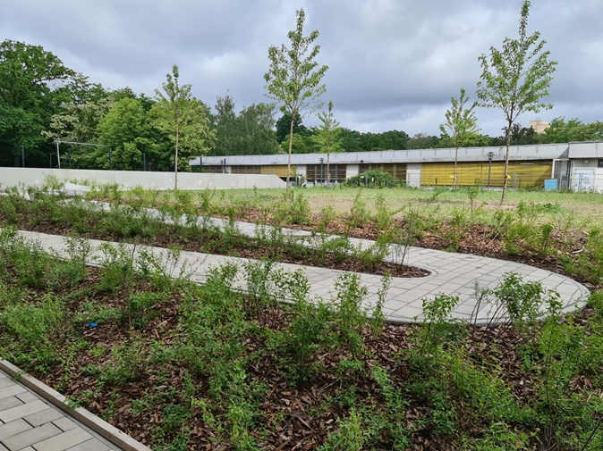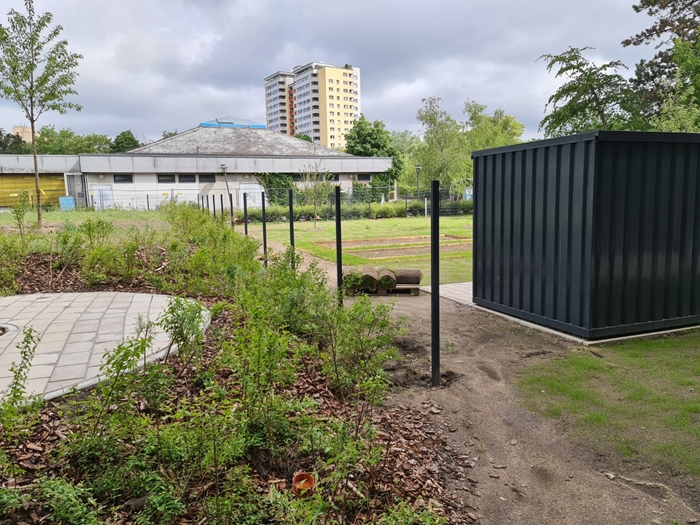 Begrenzung zwischen Schulhof und Schulgarten. Der Zaun fehlt noch. Ab August kann hier geackert werden.