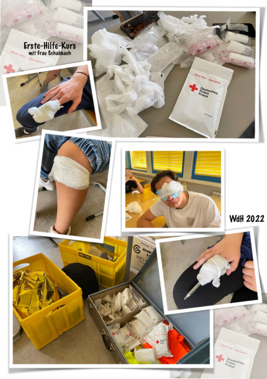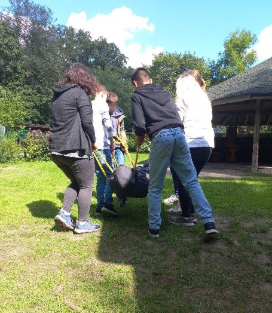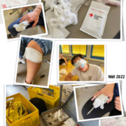 In einem anderen Spiel sollten die Schüler*innen nur mit einem langen Seil eine Rettungstrage bauen. Verschiedenste Knoten wurden ausprobiert und am Ende gelang es sogar 6 Schüler*innen den Klassenlehrer damit um den Platz zu tragen.