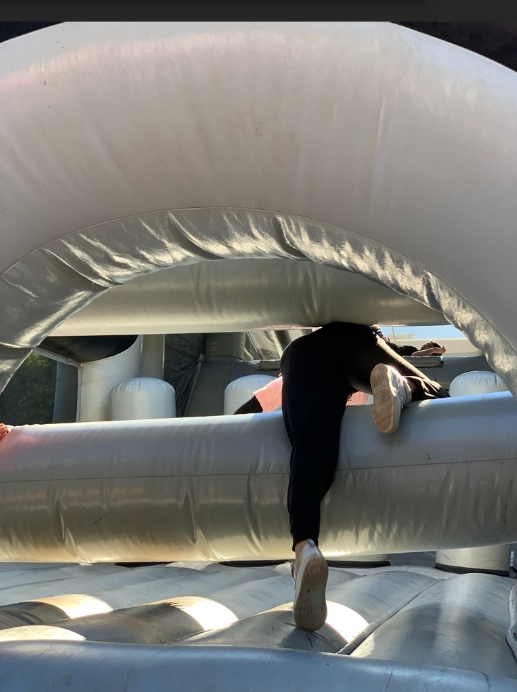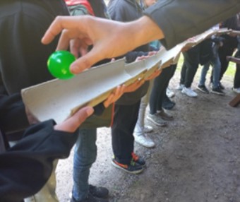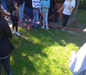Anschließend sollte die Klasse einen Golfball bergen. Dieser lag locker auf einem Ring, der wiederum mit mehreren Schnüren balanciert werden musste. Groß war die Begeisterung der Klasse, als die Klassenlehrerin Augenbinden hervorholte und der Schwierigkeitsgrad weiter gesteigert wurde. Nun mussten die Mitschüler*innen, die die Schnüre balancierten, navigiert werden.