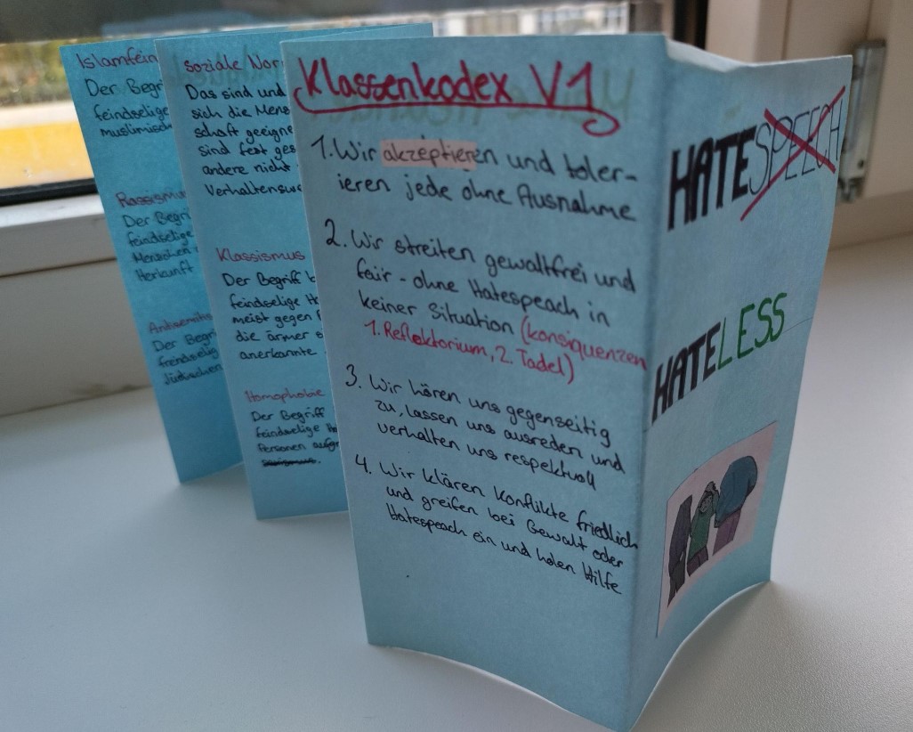 Nicht zuletzt haben die Schüler*innen Ansätze von gewaltfreier Kommunikation kennengelernt und erfahren, dass Zivilcourage notwendig ist, um Betroffene zu unterstützen. In selbstausgedachten Rollenspielen haben sie Möglichkeiten einer Intervention im Falle von Hatespeech erprobt. Die Erweiterung der eigenen Perspektive und mögliche Handlungs-/Lösungsansätze standen dabei im Vordergrund.
