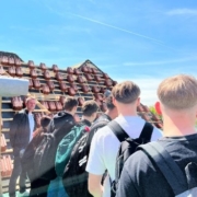 Drei Auszubildende der Firma stellten sich zunächst den Fragen unserer Schüler*innen, die unter anderem gerne erfahren wollten, wie die Auszubildenden zu ihrem Ausbildungsberuf gekommen sind und was man in diesem Beruf verdienen kann. Im Anschluss daran konnten unsere Schüler*innen die drei bei ihrer Arbeit auf dem Dach beobachten und einen ersten Einblick in den Beruf eines Dachdeckers gewinnen. Mit vielen neuen Eindrücken, einem Zollstock für jede*n und konkreten Praktikumsangeboten machten wir uns auf den Rückweg zur Schule.