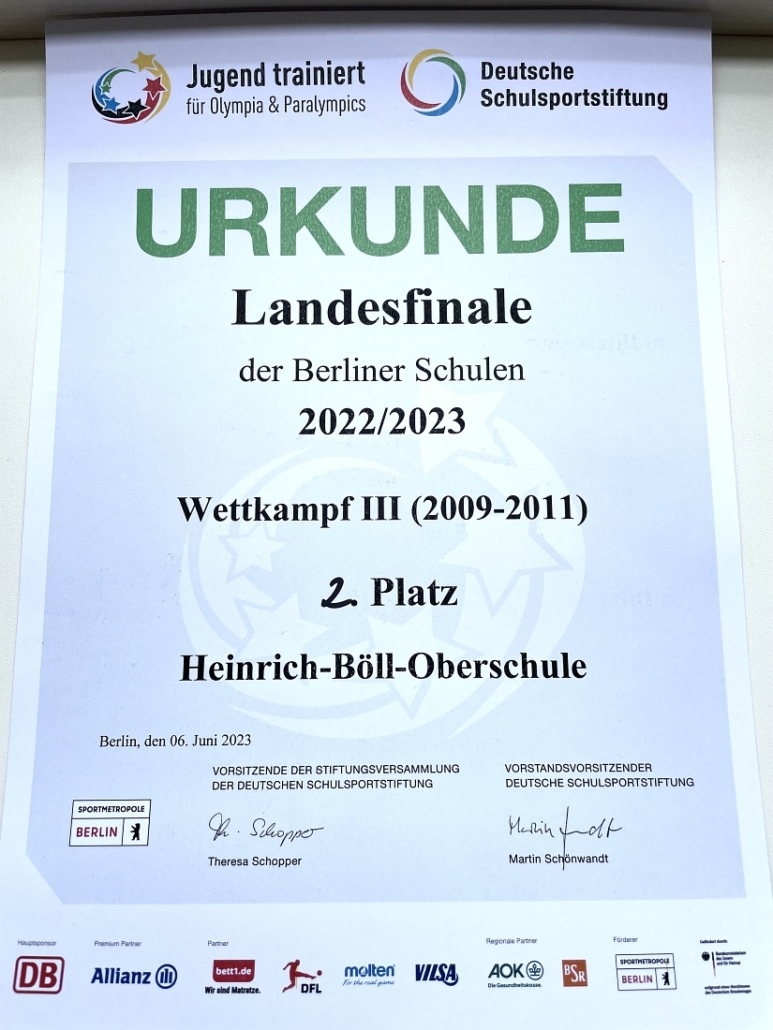 Im Mai konnten wir sowohl die Spandauer Runde als auch die Regionalrunde Nordwest ungeschlagen und mit insgesamt 23:4 Toren in sechs Spielen mit dem ersten Platz für uns entscheiden. Dadurch haben wir uns für die Endrunde der Berliner Schulen (ohne die Eliteschulen des Sports) qualifiziert. In dieser Runde mussten wir gegen das Paul-Natorp-Gymnasium, das Dathe-Gymnasium und die Otto-Hahn-Schule antreten.