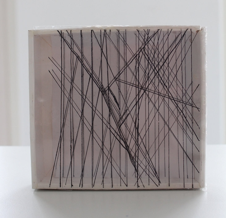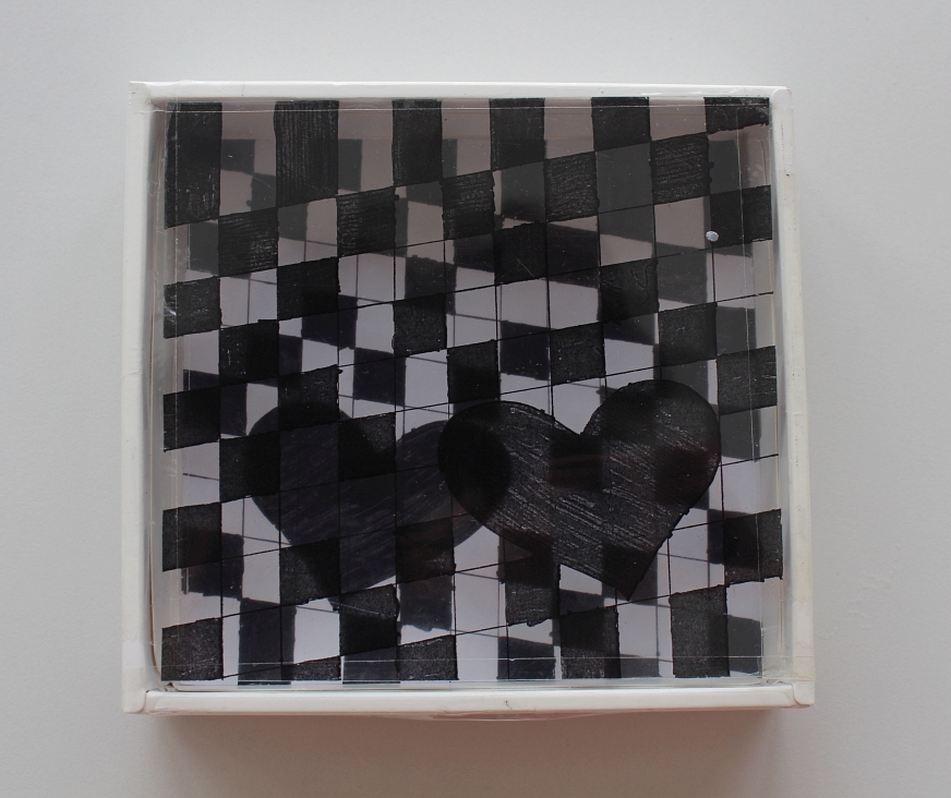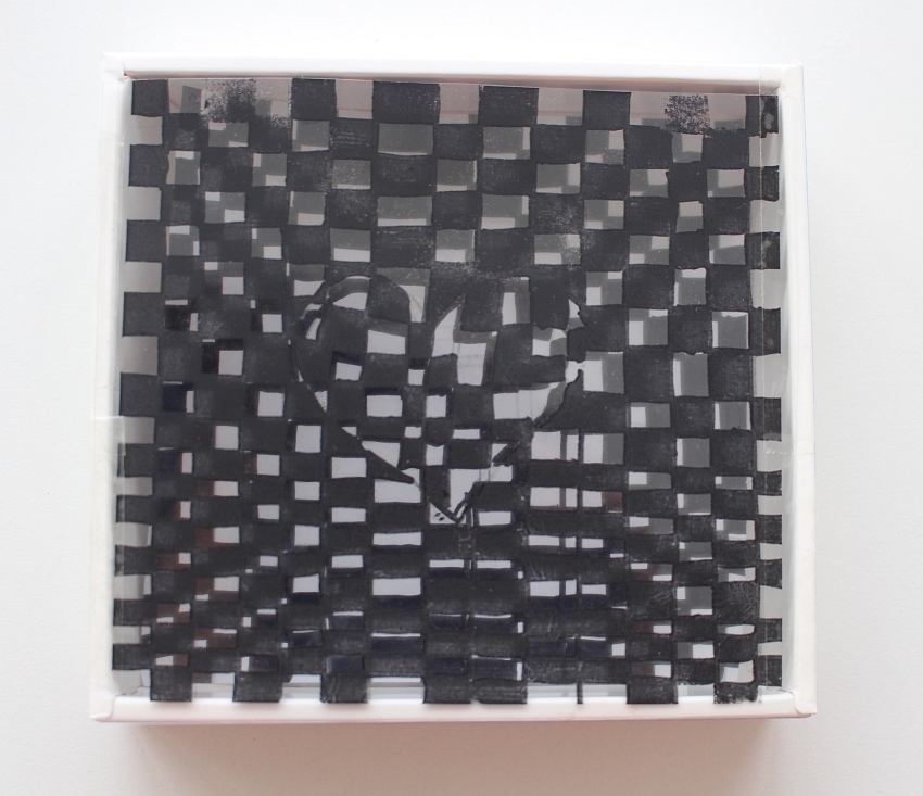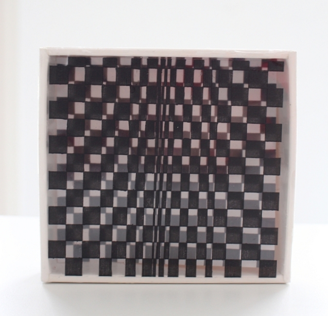 Die Zeichnung wurde auf Folie kopiert und im Format einer annähernd quadratischen Schachtel geschnitten. Die Zeichnung am Boden der Schachtel wird durch die oberhalb befestigte Folie dupliziert. Der gewünschte Flimmereffekt ergibt sich durch das Spiel mit der Dopplung ganz wie von selbst – und eröffnet aus dem Gegenüber der grafisch gestalteten Flächen einen spannenden Raum.