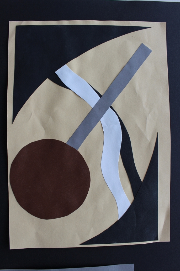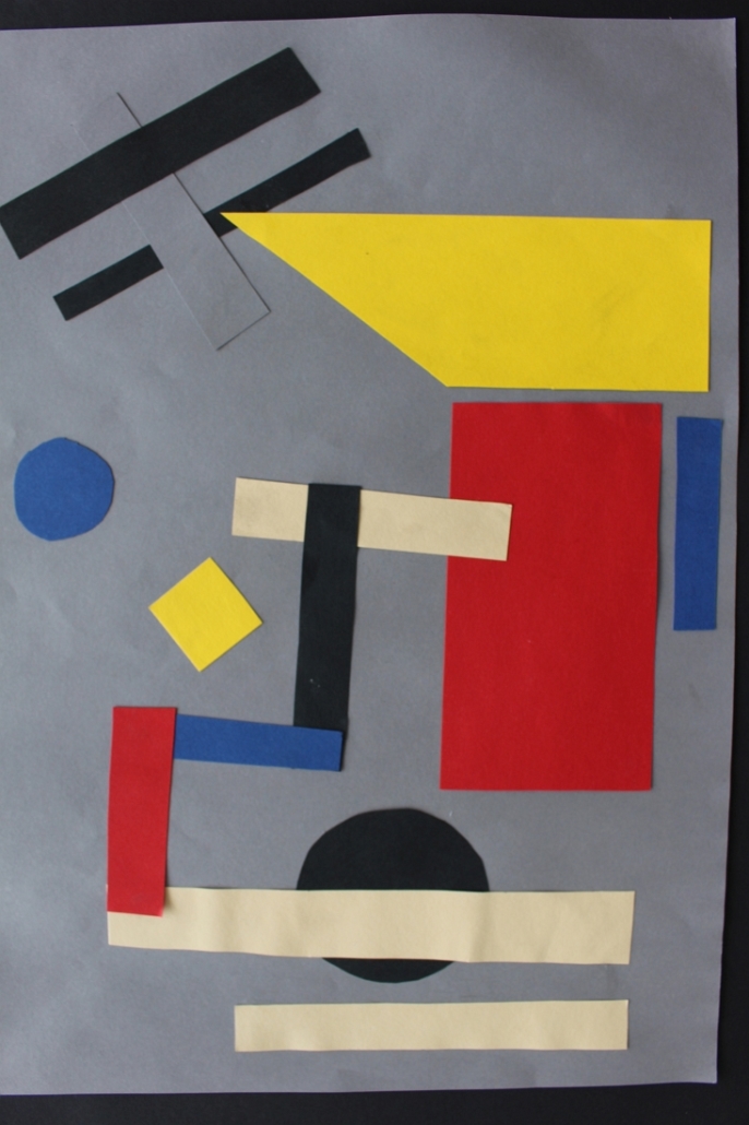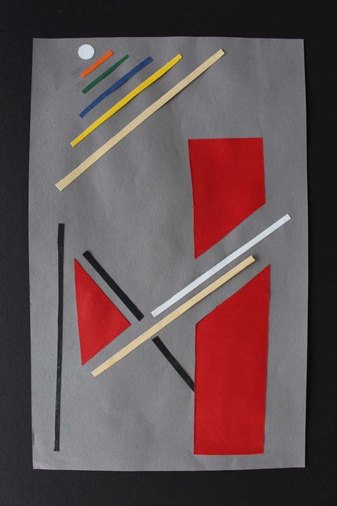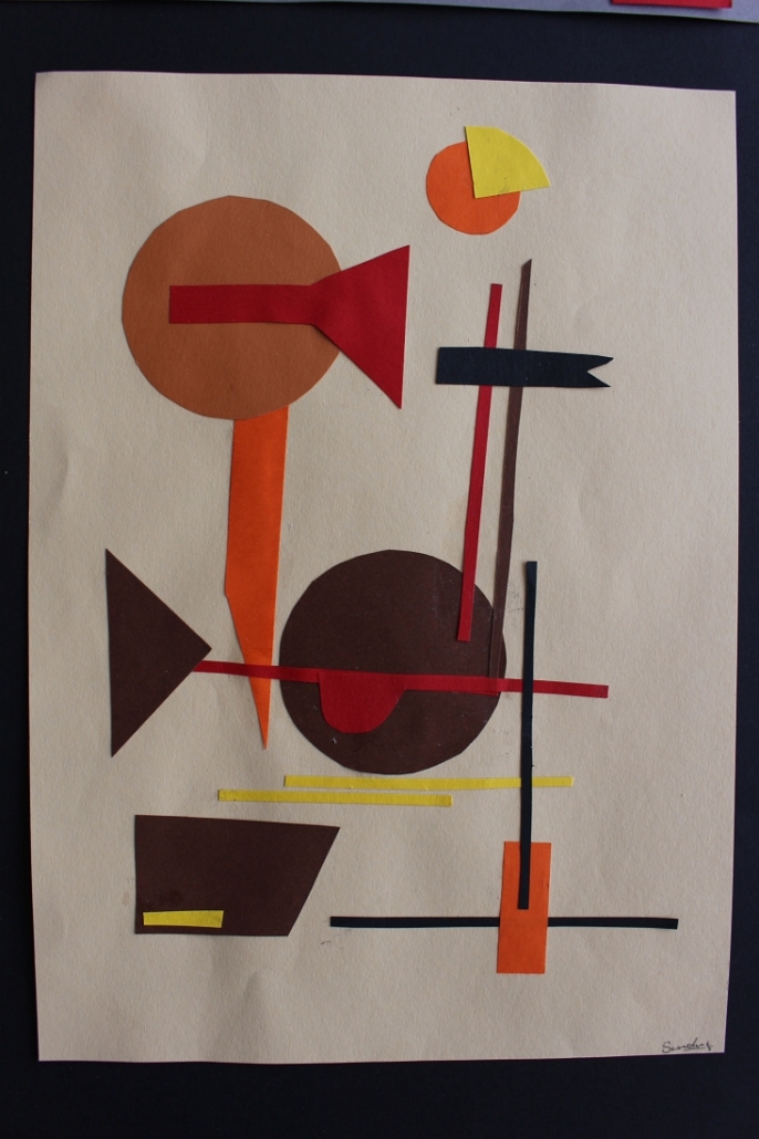 Angeregt durch konstruktivistische Formvorlagen erprobten die Schüler*innen die Kunst der Komposition aus farbigen Flächen und Linien mit Farb- und Größenkontrasten, ohne dass dabei etwas eindeutig Wiedererkennbares entsteht. Dass Komposition und Ausdruck in der bildenden Kunst zahlreiche Ähnlichkeiten mit der Musik und ihren lauten und leisen Tönen, schnellen und langsamen Rhythmen aufweisen, haben die Schüler*innen erfahren, als sie ihre Collagen zu einem Musikstück ihrer Wahl gestalteten.