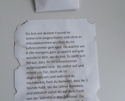Nur wenige der Schüler*innen konnten zu Beginn der Woche mit dem Escape Spiel etwas anfangen, ein paar waren ein einziges Mal in einem Escape Raum, nur ein Schüler hatte eine Spielpraxis. Die Herausforderung, ein Escape Spiel zu erstellen, brachte für fast alle teilnehmenden Schüler*innen jede Menge Herausforderungen. Zuerst wurde also gespielt. Dann haben wir erkundet, was ein Escape Spiel ausmacht. Ein Rätsel so zu erstellen, dass man am Ende ohne Lösungsbögen mitbekommt, ob man ihn richtig gelöst hat, war nicht so einfach. Einen roten Faden zu behalten, war nicht minder schwierig. Sich für Materialien zu entscheiden fiel dagegen deutlich einfacher. Je nach Neigungen der Schüler*innen entstanden drei verschiedene Escape Spiele: online zum Thema Tschernobyl, ein Horror Escape in einem dunklen Raum sowie Flucht aus dem Schulgebäude. Die Spiele wurden am letzten Tag auch von den Schüler*innen aus einer anderen Gruppe mit Erfolg gespielt. Sowohl die Macher*innen als auch Teilnehmer*innen hatten dabei viel Spaß.