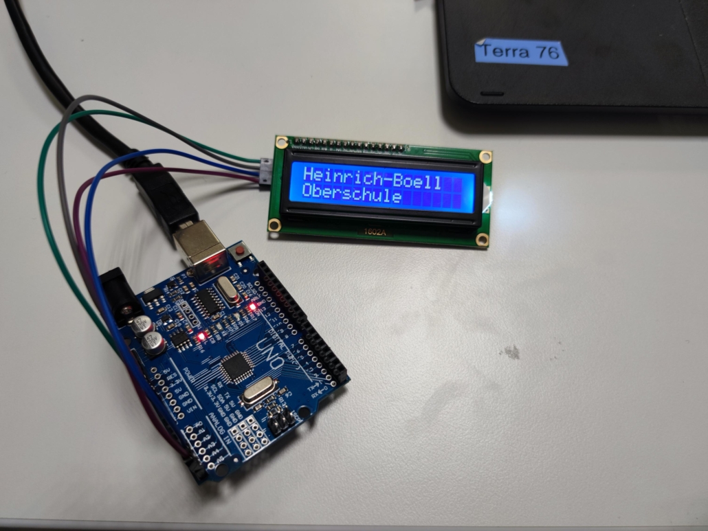 Wir haben einen Arduino mit C/C++ dazu programmiert, um einen Text auf einem LCD anzuzeigen. Auf dem Bild wird der Name unserer Schule angezeigt. Alternativ könnten wir auch Sensordaten wie z.B. Temperatur anzeigen lassen.