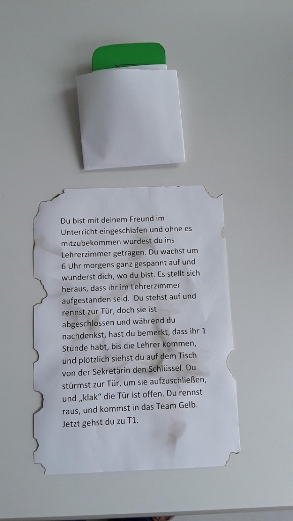 Nur wenige der Schüler*innen konnten zu Beginn der Woche mit dem Escape Spiel etwas anfangen, ein paar waren ein einziges Mal in einem Escape Raum, nur ein Schüler hatte eine Spielpraxis. Die Herausforderung, ein Escape Spiel zu erstellen, brachte für fast alle teilnehmenden Schüler*innen jede Menge Herausforderungen. Zuerst wurde also gespielt. Dann haben wir erkundet, was ein Escape Spiel ausmacht. Ein Rätsel so zu erstellen, dass man am Ende ohne Lösungsbögen mitbekommt, ob man ihn richtig gelöst hat, war nicht so einfach. Einen roten Faden zu behalten, war nicht minder schwierig. Sich für Materialien zu entscheiden fiel dagegen deutlich einfacher. Je nach Neigungen der Schüler*innen entstanden drei verschiedene Escape Spiele: online zum Thema Tschernobyl, ein Horror Escape in einem dunklen Raum sowie Flucht aus dem Schulgebäude. Die Spiele wurden am letzten Tag auch von den Schüler*innen aus einer anderen Gruppe mit Erfolg gespielt. Sowohl die Macher*innen als auch Teilnehmer*innen hatten dabei viel Spaß.