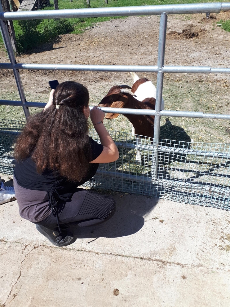 Wie lebt ein Huhn, wie ein Schwein? Welche Bedürfnisse haben sie? Und wie werden sie gehalten in der konventionellen und in der ökologischen Landwirtschaft? Um das herauszufinden, haben wir im Angebot „Gut zu Tieren – Gut für Tiere“ Steckbriefe zu den Tieren geschrieben, Filme geguckt, einem Experten für Agrarwirtschaft in einer Zoom-Konferenz ganz viele Fragen gestellt und ausführliche Antworten bekommen und – Highlight! – zwei Mal den Bauernhof „Peters Landwirtschaft“ besucht. Bauer Hans hält Zuchtkühe, Schweine, Gänse und Hühner, und Ziegen gibt es auf dem Hof auch. Wir haben mit ihm die Kühe auf eine andere Weide getrieben, sind mit dem Trecker zum Heuwenden gefahren, haben einen neuen Zaun für das Hühnermobil gezogen und haben die Tiere beobachtet, gestreichelt und gefüttert. Und ganz nebenbei haben wir Getreidesorten und Heu von Stroh unterscheiden gelernt. Die Fotos zeigen Eindrücke von unserem zweiten Bauernhofbesuch.
