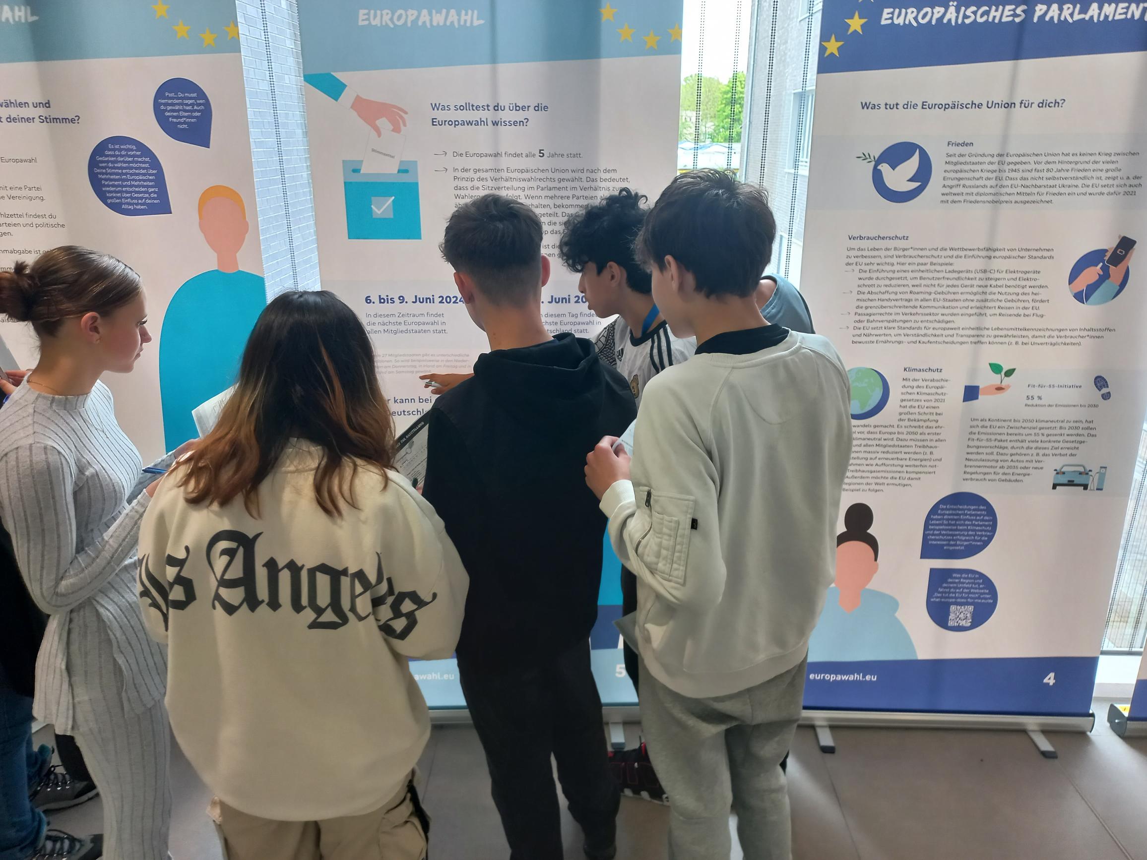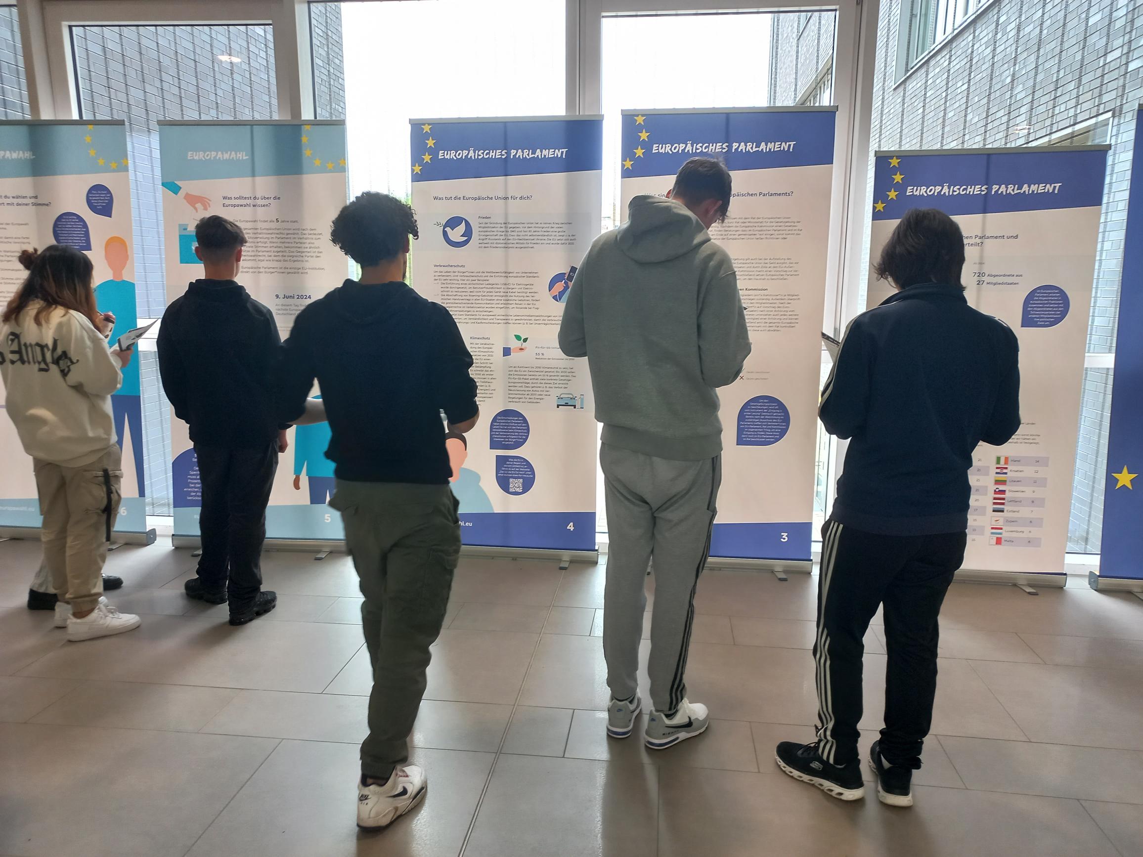 Um das Thema “Europäische Union und Wahlen” in das Bewusstsein der Schulgemeinschaft zu rücken, haben Kurse und und vor allem die Schüler*innen des 9. und 10. Jahrgangs im Rahmen des Unterrichtes die Ausstellung besucht. Im Anschluss haben die Schülerinnen und Schüler ein Quiz bearbeitet und sind gemeinsam mit ihren Lehrkräften ins Gespräch gekommen: Was bedeutet/tut die EU für mich? Was tut das Europäische Parlament? Wie und wann wird gewählt?