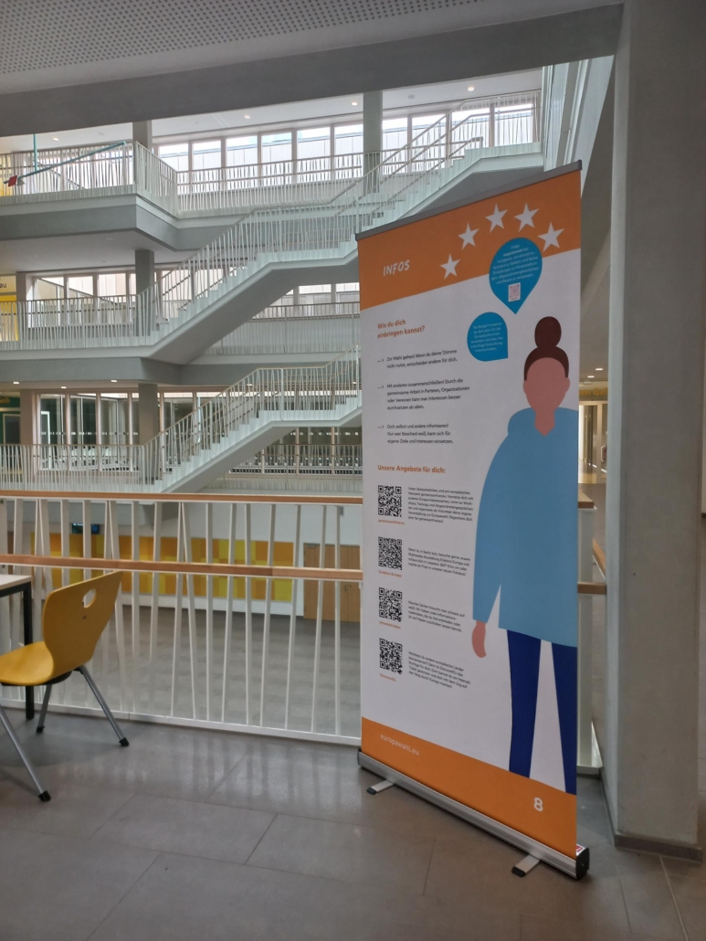 Unter dem Motto „Nutze deine Stimme“ gastierte vom 8. -17. April die Wanderausstellung „EU on Tour“ zur Europawahl 2024 an der HBO. Im Foyer im 1. OG konnten alle Schülerinnen und Schüler sowie Besucher*innen und Lehrkräfte sich auf acht Postern über die Europäische Union und die Europawahlen informieren.