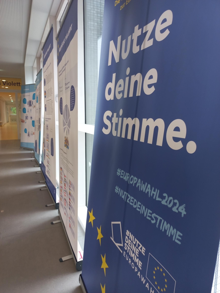 Unter dem Motto „Nutze deine Stimme“ gastierte vom 8. -17. April die Wanderausstellung „EU on Tour“ zur Europawahl 2024 an der HBO. Im Foyer im 1. OG konnten alle Schülerinnen und Schüler sowie Besucher*innen und Lehrkräfte sich auf acht Postern über die Europäische Union und die Europawahlen informieren.