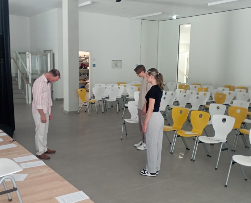 Die Herausforderung handelt von Bühnensprache und wie man sich auf der Theaterbühne verhält. Herr Verroen leitet die Herausforderung Bühnensprache an. Sein Ziel ist es, dass die Teilnehmenden sich trauen, vor Leuten zu sprechen und auch zu spielen.