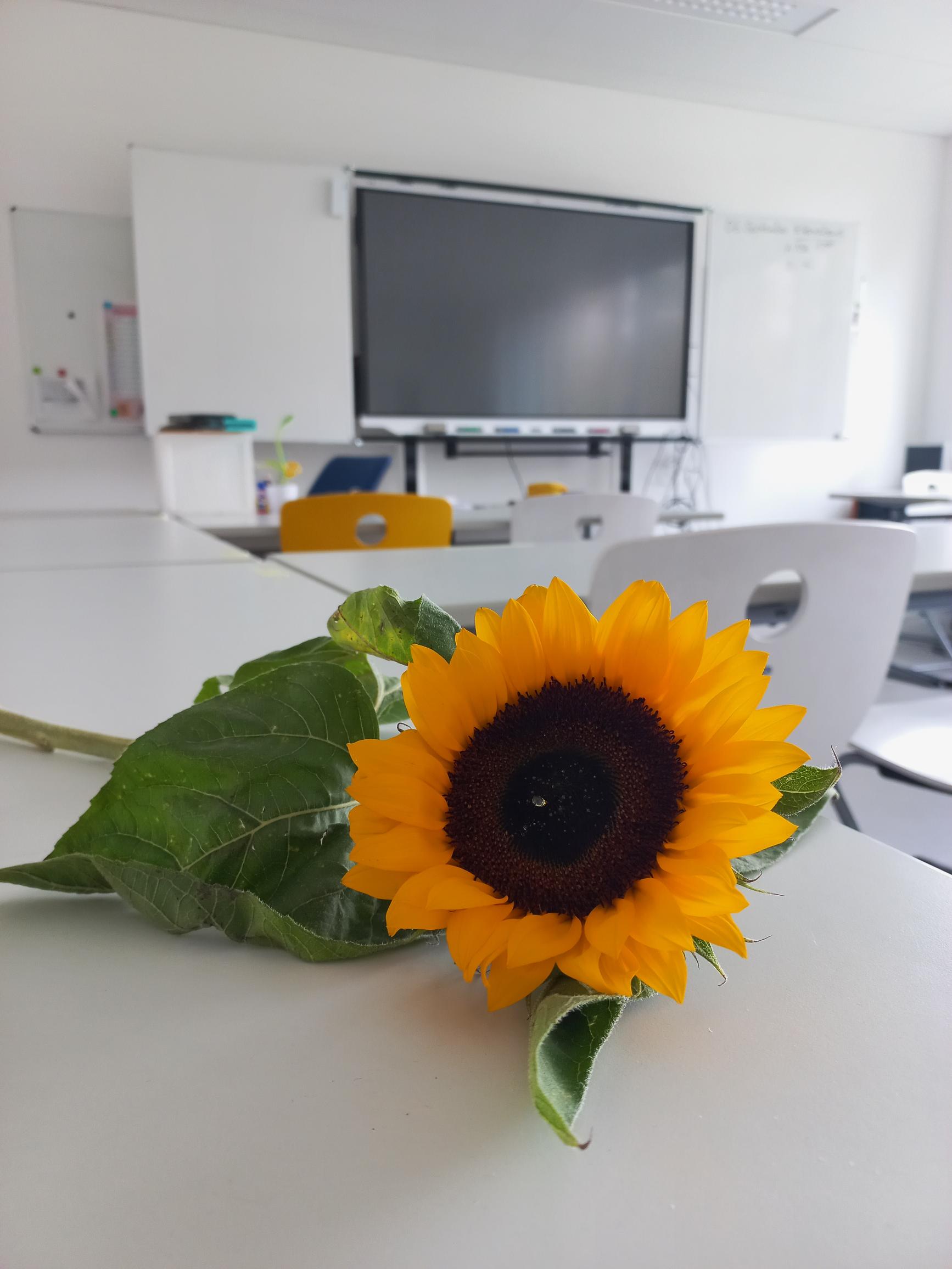 Schließlich durften die Klassenleitungen auf der Bühne ihre neuen Schülerinnen und Schüler persönlich mit der inzwischen traditionellen Sonnenblume begrüßen. Nach einem ersten gemeinsamen Foto ging es zum gegenseitigen Kennenlernen in die Klassenräume, wo auch die älteren Schüler*innen die Neuankömmlinge begrüßen konnten.